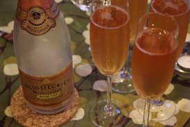 Heidsieck & Co. Monopole Brut Rosé Champagne Non-Vintage. Iridescent platinum/copper color, with a floral nose (mostly roses), plus fresh bread dough. Almost creamy in the mouth, very elegant, with nice tartness, supporting cranberry, honey, and butterscotch flavors. With time, more cherry notes show up. About $45.
